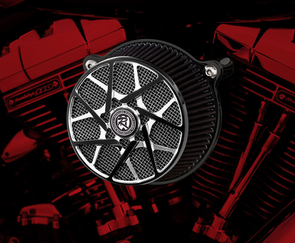 Retailing at just $349.00, these Air Cleaner Kits feature a CNC machined billet aluminum face plate, an oil free filtration element, internal crankcase breathers, and installation hardware. Our matching hand made face-plates can be ordered in a variety of finishes, including the finest mirror finish chrome, or hand polished Phantom-Cut Black Anodized finishes to match Renegade Wheels' designs. Renegade uses a space-age filter element which provides an air flow increase up to 20% with resulting increases in horsepower and overall engine performance. Available options include Rain Socks, Black Mesh Screen kits and a Mikuni carb adapter. Kits are available to fit most Harley models.