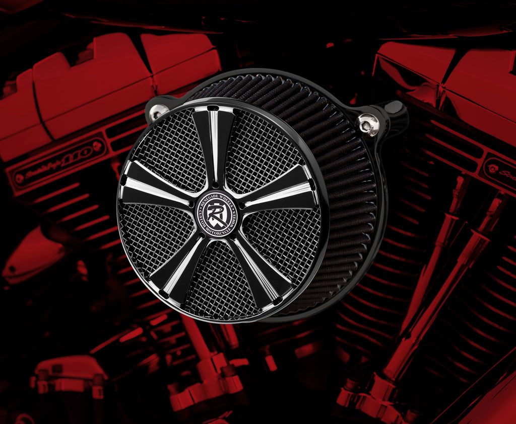 Retailing at just $349.00, the AIR CLEANER KITS feature a CNC machined billet aluminum face plate, an oil free filtration element, internal crankcase breathers, and installation hardware. Artistic face-plates can be ordered in a variety of finishes, including the finest mirror finish chrome, or hand polished Phantom-Cut finishes to match Renegade Wheels' designs. Renegade uses a space-age filter element which provides an air flow increase up to 20% with resulting increases in horsepower and overall engine performance. Available options include Rain Socks, Black Mesh Screen kits and a Mikuni carb adapter. Kits are available to fit most Harley models.