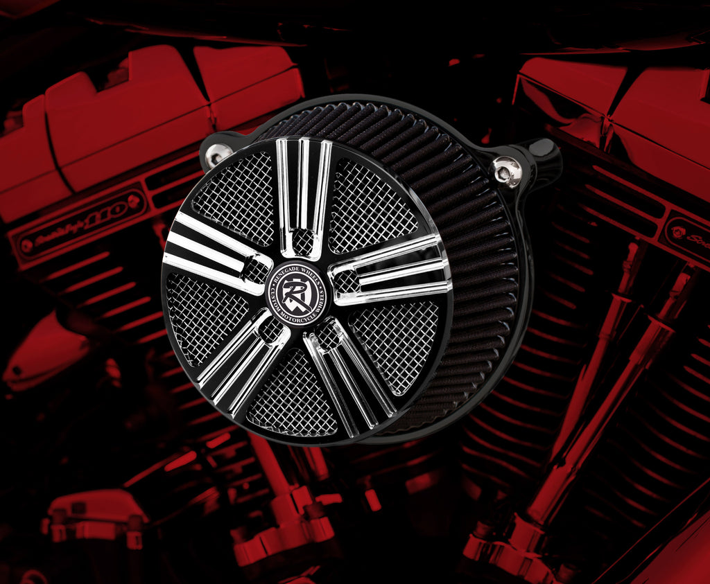 Retailing at just $349.00, these Air Cleaner Kits feature a CNC machined billet aluminum face plate, an oil free filtration element, internal crankcase breathers, and installation hardware. Our matching hand made face-plates can be ordered in a variety of finishes, including the finest mirror finish chrome, or hand polished Phantom-Cut Black Anodized finishes to match Renegade Wheels' designs. Renegade uses a space-age filter element which provides an air flow increase up to 20% with resulting increases in horsepower and overall engine performance. Available options include Rain Socks, Black Mesh Screen kits and a Mikuni carb adapter. Kits are available to fit most Harley models.