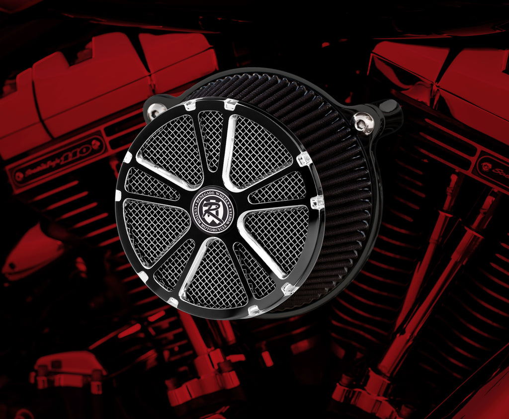 Retailing at just $349.00, these Air Cleaner Kits feature a CNC machined billet aluminum face plate, an oil free filtration element, internal crankcase breathers, and installation hardware. Our matching hand made face-plates can be ordered in a variety of finishes, including the finest mirror finish chrome, or hand polished Phantom-Cut Black Anodized finishes to match Renegade Wheels' designs. Renegade uses a space-age filter element which provides an air flow increase up to 20% with resulting increases in horsepower and overall engine performance. Available options include Rain Socks, Black Mesh Screen kits and a Mikuni carb adapter. Kits are available to fit most Harley models.