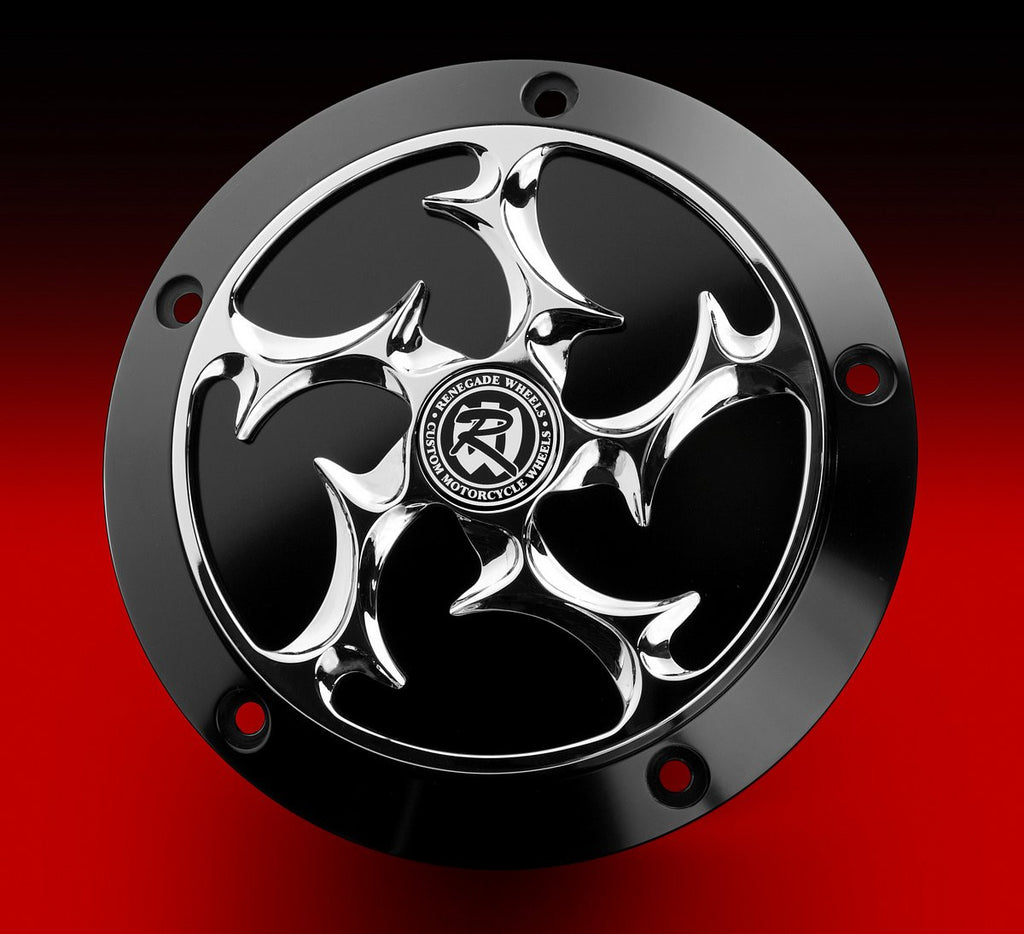 The Derby Base is available in Show Chrome or Phantom Black Anodized, and the Derby Cover is offered in matching Renegade Wheels designs in both chrome and Phantom-Cut.