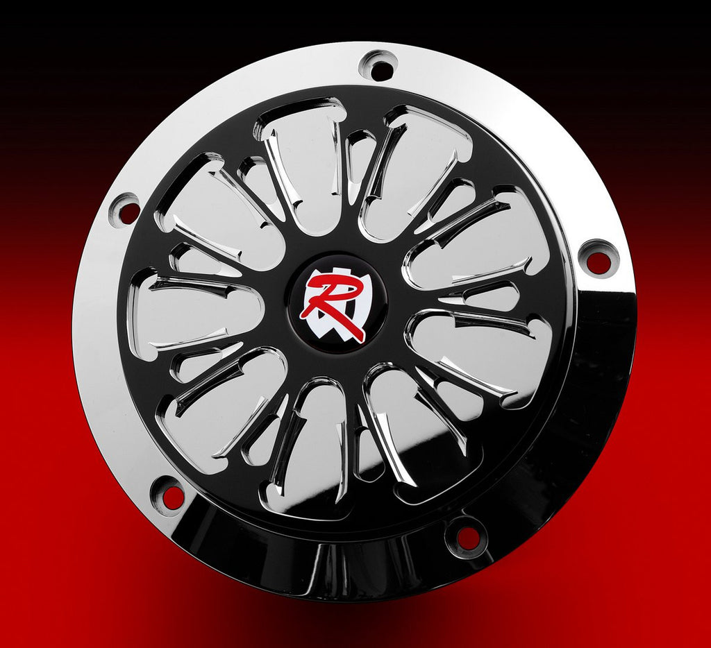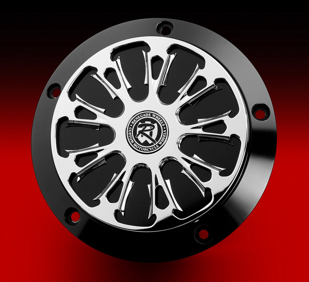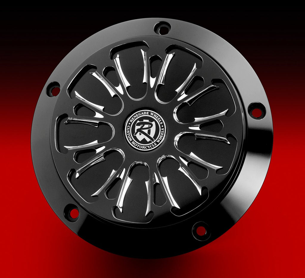 The Derby Base is available in Show Chrome or Phantom Black Anodized, and the Derby Cover is offered in matching Renegade Wheels designs in both chrome and Phantom-Cut.