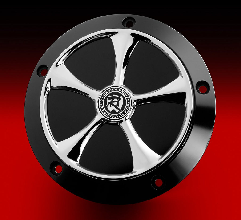 The Derby Base is available in Show Chrome or Phantom Black Anodized, and the Derby Cover is offered in matching Renegade Wheels designs in both chrome and Phantom-Cut.