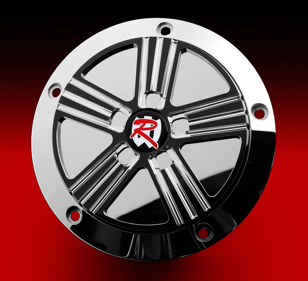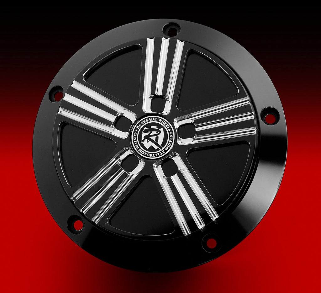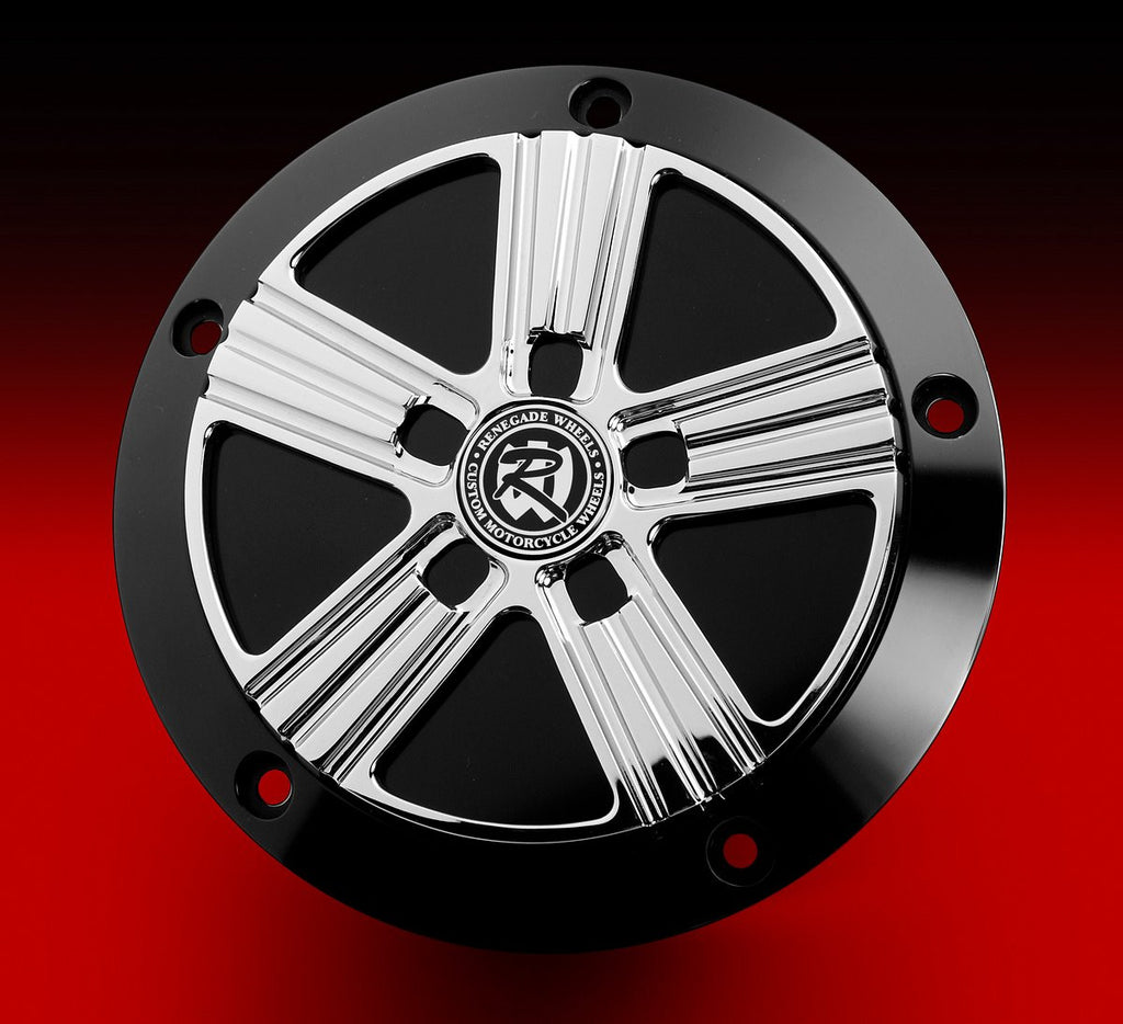 The Derby Base is available in Show Chrome or Phantom Black Anodized, and the Derby Cover is offered in matching Renegade Wheels designs in both chrome and Phantom-Cut.