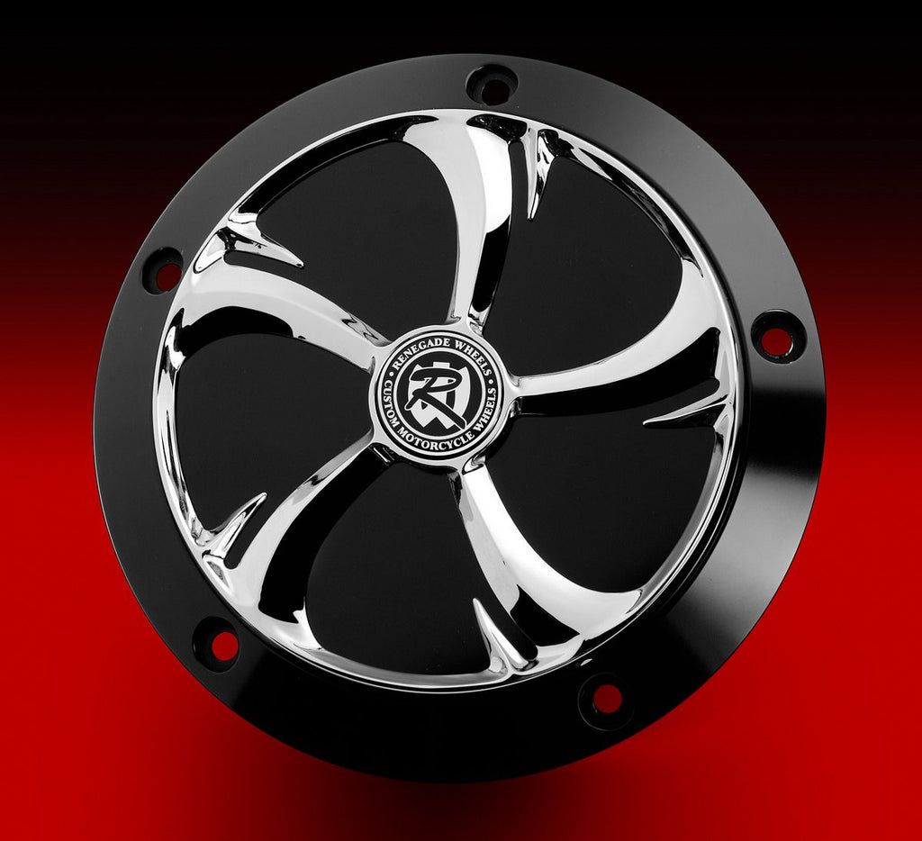 The Derby Base is available in Show Chrome or Phantom Black Anodized, and the Derby Cover is offered in matching Renegade Wheels designs in both chrome and Phantom-Cut.