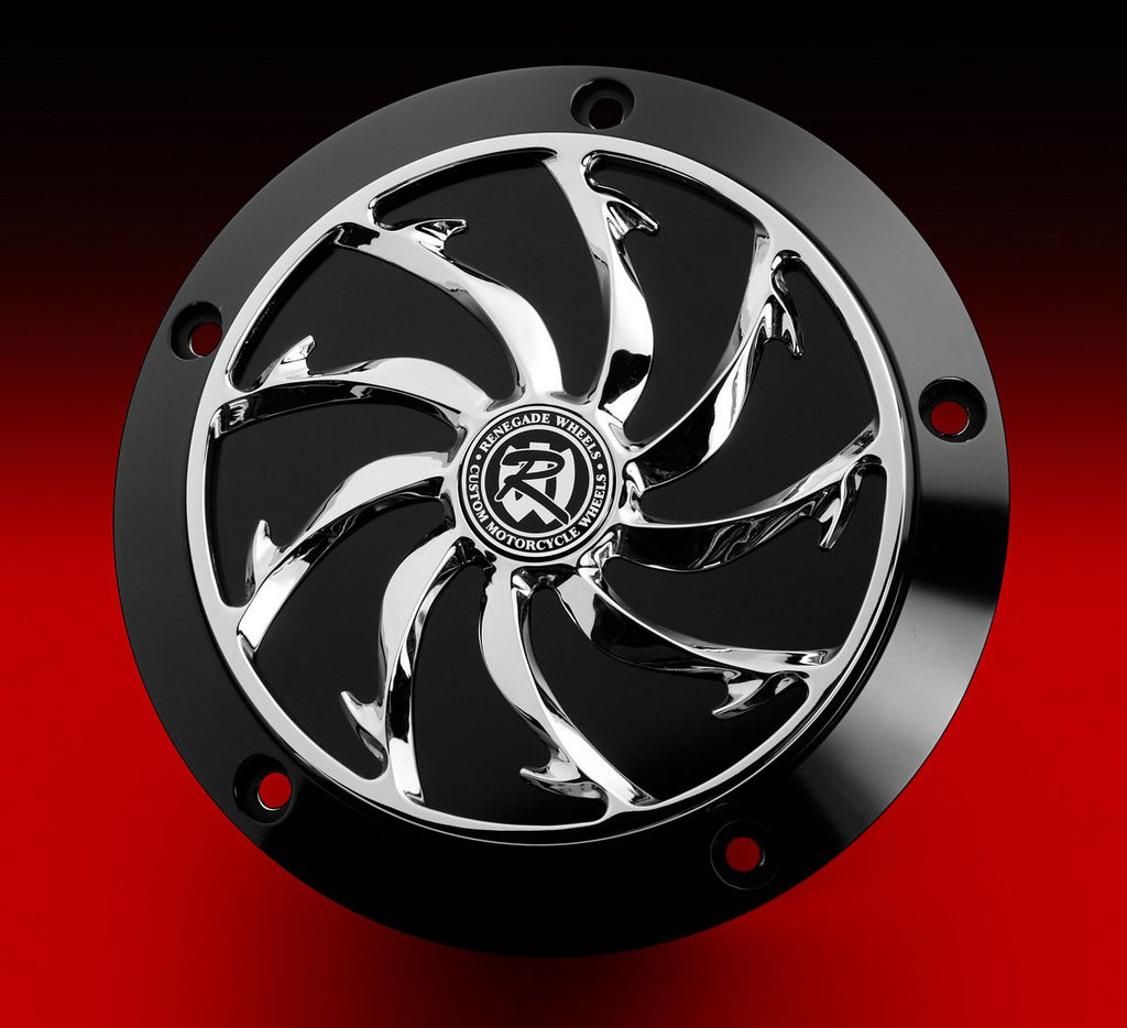The Derby Base is available in Show Chrome or Phantom Black Anodized, and the Derby Cover is offered in matching Renegade Wheels designs in both chrome and Phantom-Cut.
