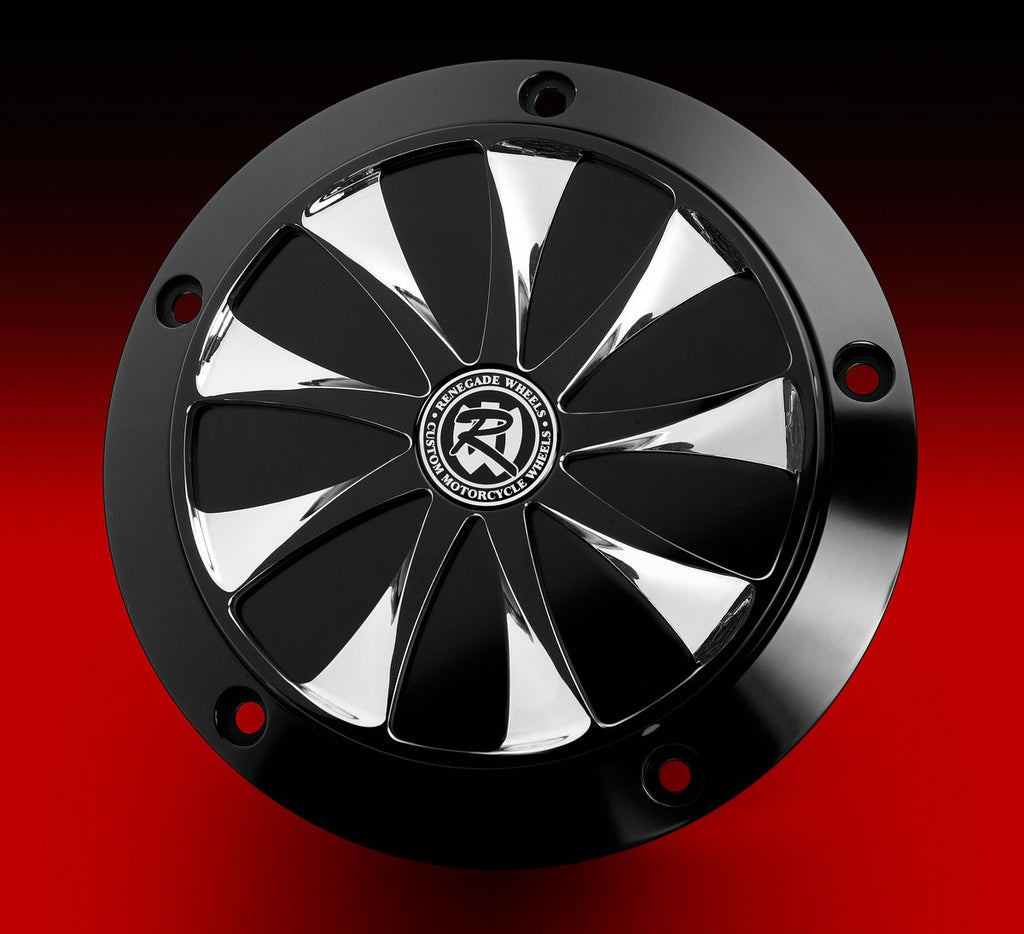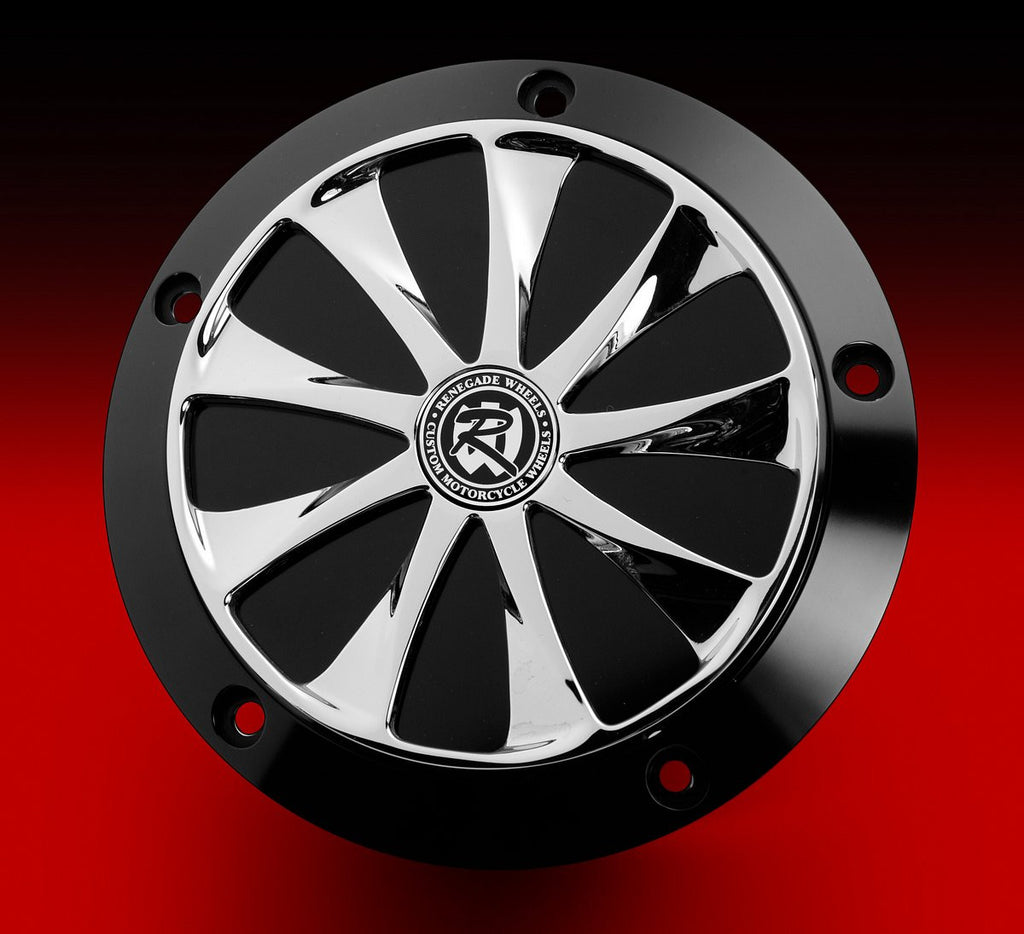 The Derby Base is available in Show Chrome or Phantom Black Anodized, and the Derby Cover is offered in matching Renegade Wheels designs in both chrome and Phantom-Cut.